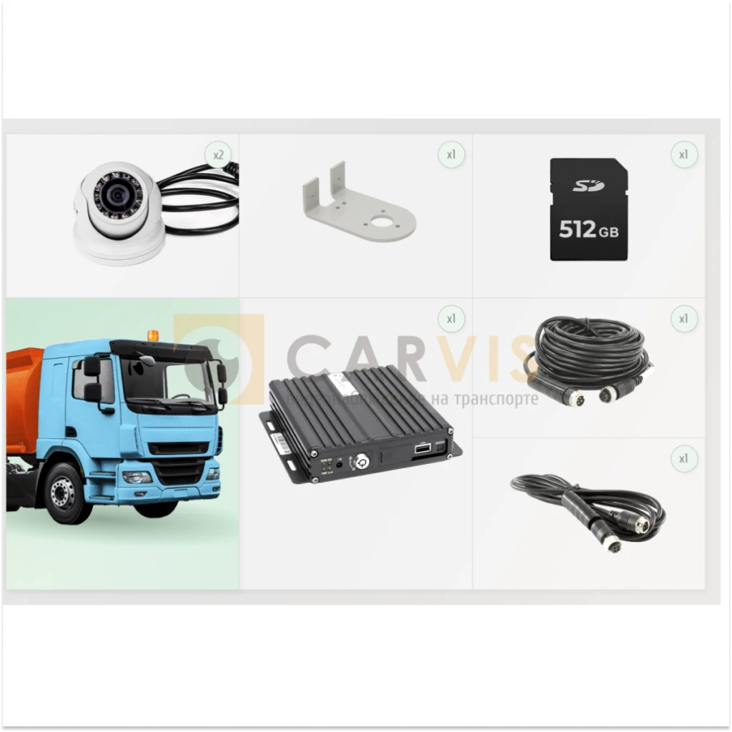 Предлагаемый набор оборудования представляет собой стандартное решение для грузовых автомобилей, выполняющих перевозку опасных грузов. При этом, в соответствии с потребностями вашей компании и характеристиками автотранспорта, возможно создать индивидуальный комплект видеонаблюдения.